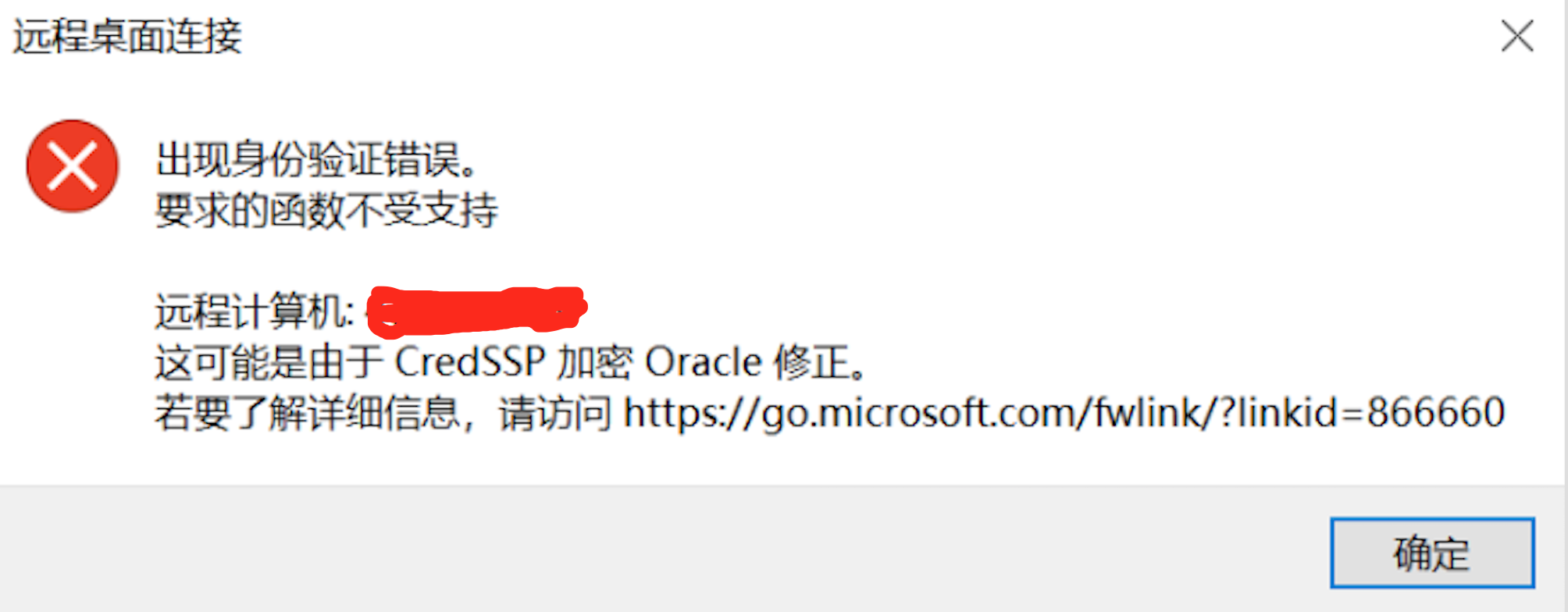 出现身份验证错误。要求的函数不支持。...这可能是由于CredSSP加密Oracle修正。*** 看错误,以为是自己账号密码错误,验证了好久没能解决。网上搜索到好多种解决方案。例如:修改注册表、卸载安装的补丁等等,都没能解决我遇到的问题。